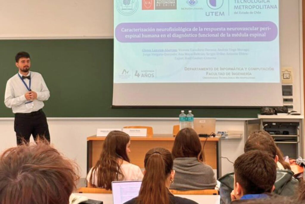 La agenda continuó en Zaragoza con la participación en el Congreso Anual de la Sociedad Española de Ingeniería Biomédica (CASEIB). En esta instancia, Glenn Lanyon, Vicente Escudero y Andrés Vega presentaron tres ponencias científicas vinculadas al análisis de señales biomédicas, técnicas de machine learning y aplicaciones de fNIRS en diagnóstico funcional. Asimismo, Gabriel Araya participó en la competencia de póster con el trabajo “Spine-fNIRS Web: Interfaz Gráfica Remota para el Análisis y Visualización de Señales de la Respuesta Neurovascular en la Médula Espinal”, visibilizando el desarrollo de investigación avanzada a nivel de pregrado.